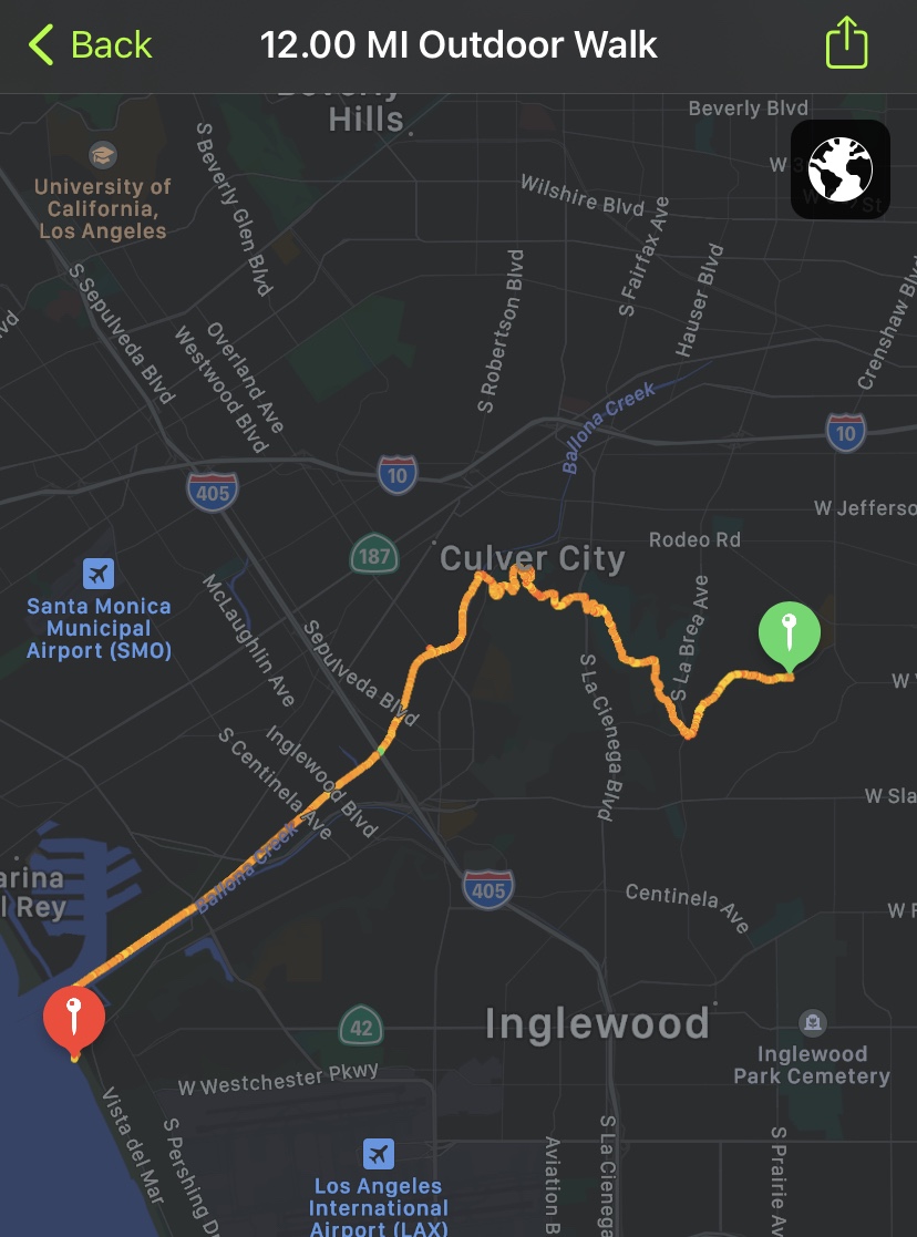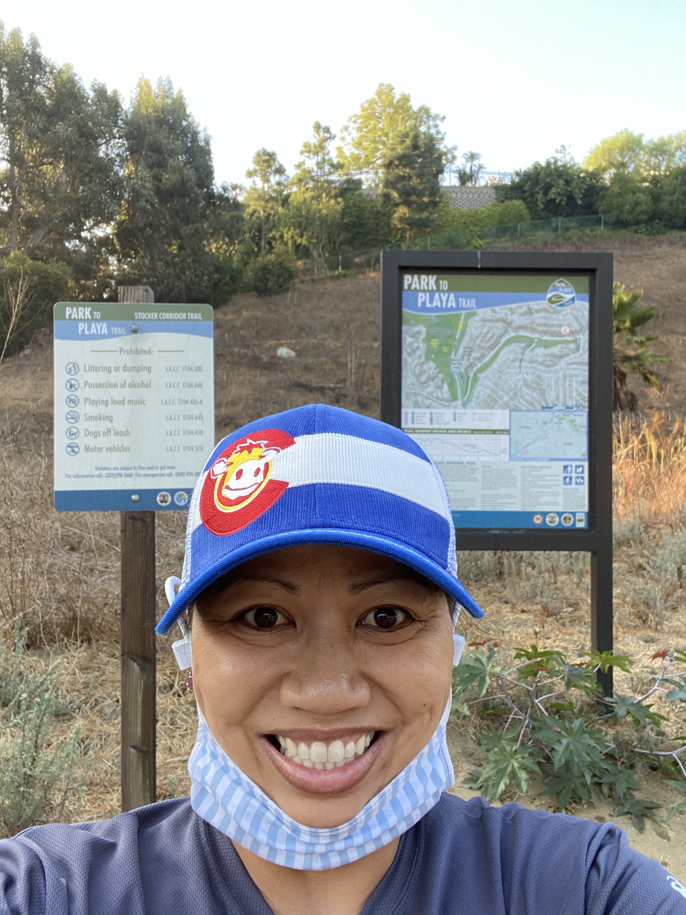 The Park to Playa Regional Trail is 13 miles. But my walk from the starting point near Stocker and Presidio to the beach was only 12 miles. Had I meandered around Baldwin Hills Scenic Overlook, I would have logged another mile. But given the crowd– even at 9:00 a.m. on a Monday– and a lot of people NOT wearing a mask (GRRRR!!!!), I took the slightly shorter trail down to Hetzler Road. I wanted to avoid the crowd.